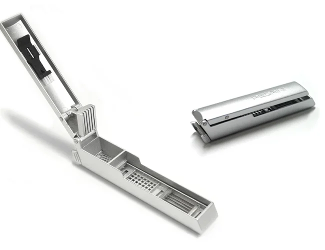- Cast zinc alloy body and pusher, stainless steel slicer, and nylon brush
