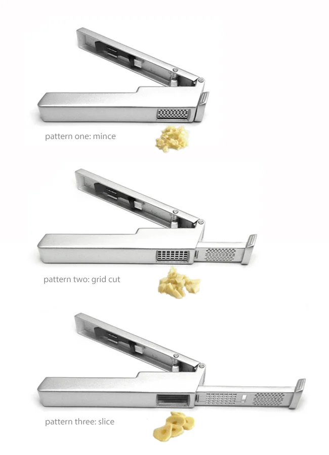 - One single sliding blade, which has two different patterns of holes for mincing and one section for slicing garlic