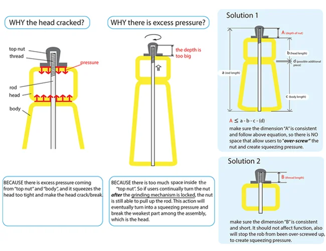 Provided the factory with two solutions as shown in the right image. After experiments, the factory adopted the solution 1 and added a washer to prevent “over screw” action.