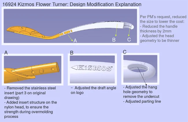 On the original drawing, the geometry required unnecessarily large tooling. The drawing asked to use a steel rod as the internal connection for the nylon head and the nylon handle. The tooling sample showed a gap and a weak point between the connection.