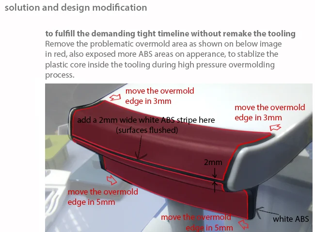 Remove the problematic overmold area as shown on below image in red, also exposed more ABS areas on appearance, to stabilize the plastic core inside the tooling during high pressure overmolding process. (see the 3rd image on this page)